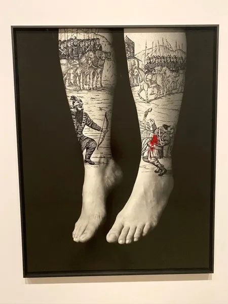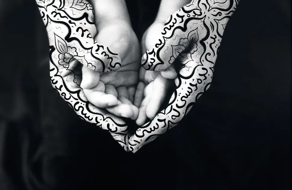 The Allah series includes a full-size photograph of a Muslim woman, clad head-to-toe in black, her right arm extended from her garb to hold the hand of a small naked boy, his skin liberally covered in traditional Persian decorative patterns.