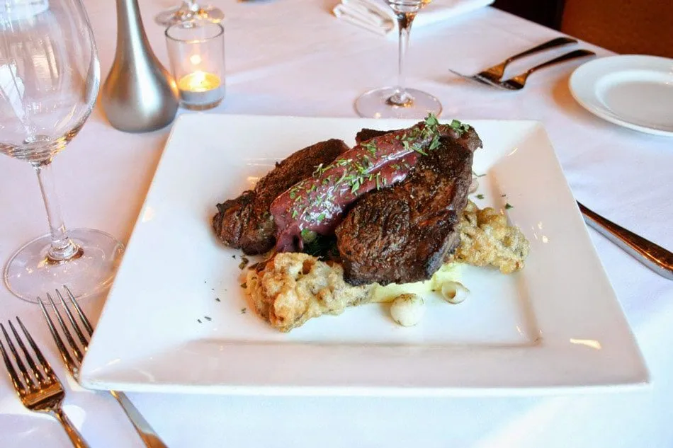 The debate raged while we sipped our wine and awaited our entrées. I mean we could have ordered the Duo of Duck—a confit duck leg and seared duck breast with fennel-green garlic fritter,sautéed swiss chard and smoked tomato-bean ragout and red wine reduction from their wood burning grill after all. I mean why do we always go with the safe choice? Little did we know until dinner was served!